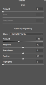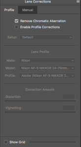 One setting I apply to every photo is vignetting. I add a slight dark vignette which adds a a bit of depth to the image. As I add it to all of them it also makes them all slightly similar. I always tick Remove Chromatic Aberration, Enable Profile Correction depends on the photo. Sometimes it improves it but most time I leave it unticked.