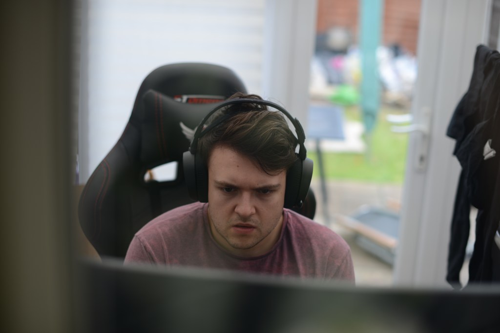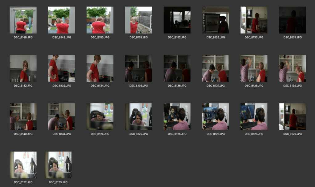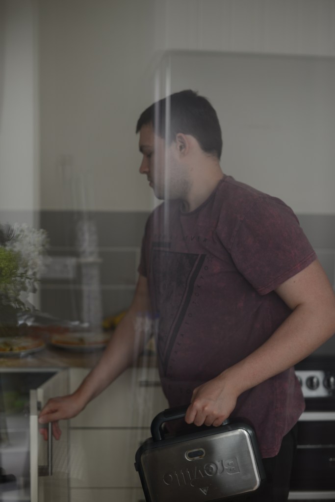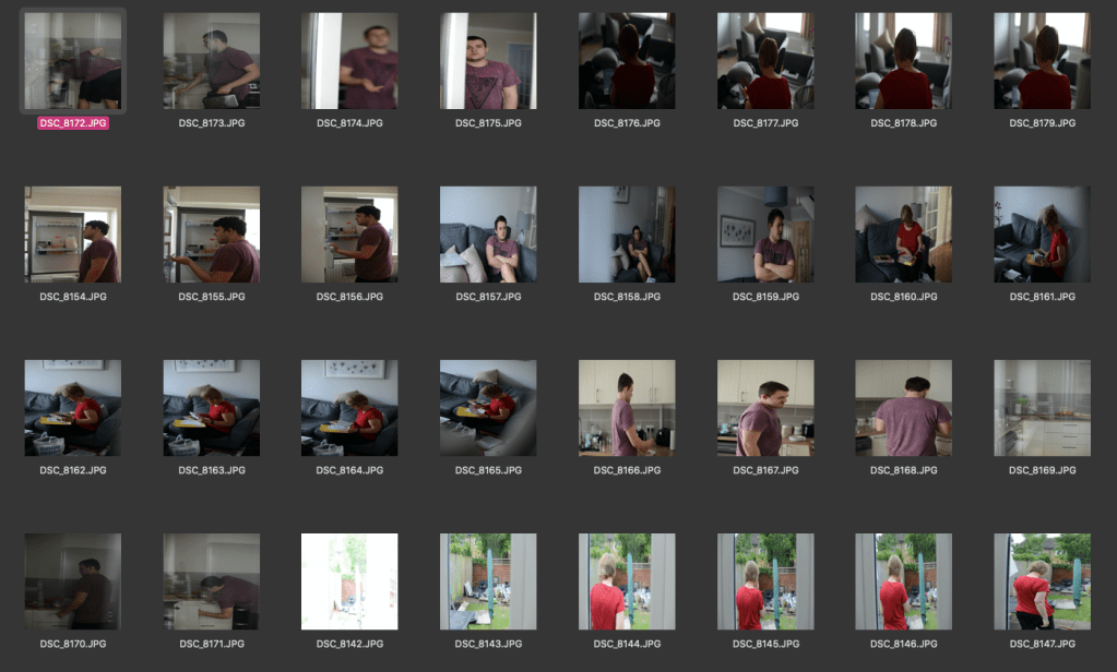 For this shoot I photographed the two people I live with throughout the day. In my theoretical research I understood that distancing myself from the subject can change my perspective on the subject. I have spent a lot of time with these people and so seeing them almost from a strangers point of view will make it more interesting. It was an overcast day so I was using quite dull lighting with little shadow. I used a shallow depth of field to make the subject stand out from the background. This allowed me to use a faster shutter speed as I was taking photos as they were moving.
