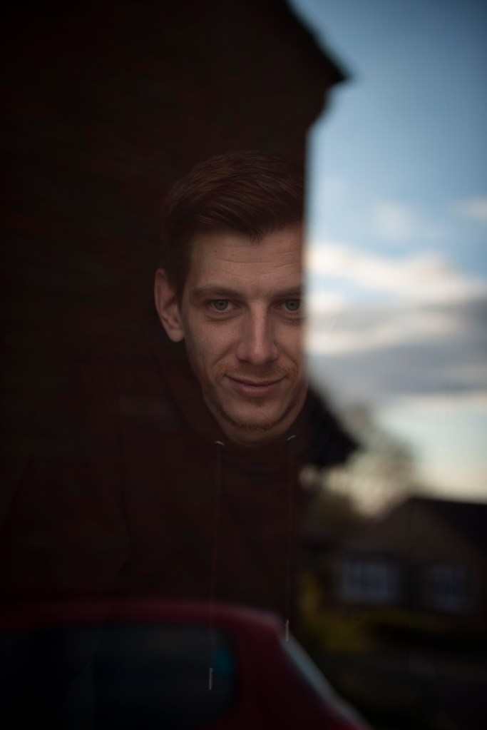 This was the first shoot, again this was shot in the evening. I really like the effect of the shadow. There was a house too the side which created enough dark reflection for the subject to be seen. The sky in the rest of the image adds more colour and tone. In some of the photos, some of his face fades into the reflection of the sky which I think makes it more intriguing. I had to open the window at a bit of an angle so that the sun wasn’t shining right onto the glass. This meant that the window was at an angle to the subject as he still faced forward. Because of this it was best to not have the window frame in the shot as it wasn’t straight.