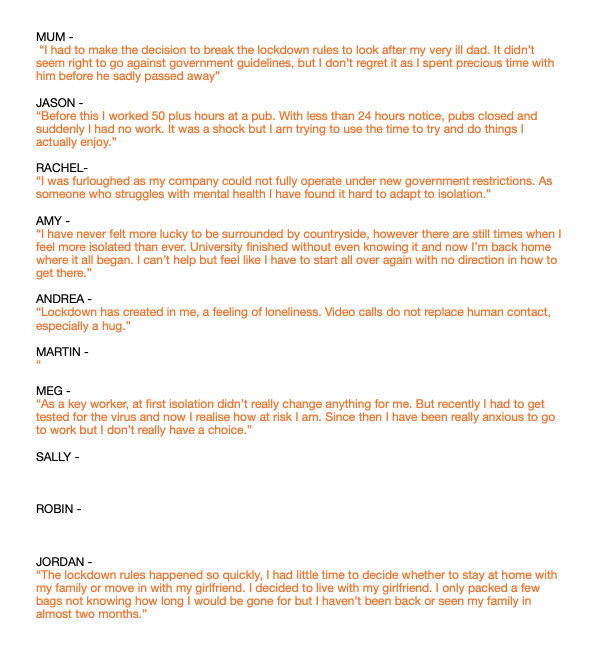As I am including text about each person’s story, I have messaged each person and asked them to write a few lines about their lockdown experience. The responses I got were so interesting. When I was shooting the photos I had little idea how much these people were effective. What was also interesting is that how differently people were affected, some talked about work, whereas other talked about the uncertainty of university. Now I have most of the text from people, I can see how effective this will be alongside the portraits.